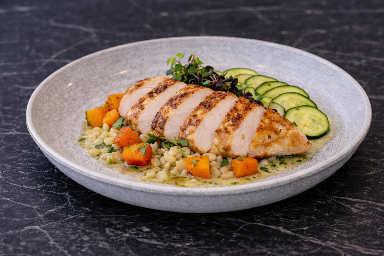 Golden corn-fed chicken breast with pumpkin, Pasta Sotto, and tender zucchini finished with fresh herbs.