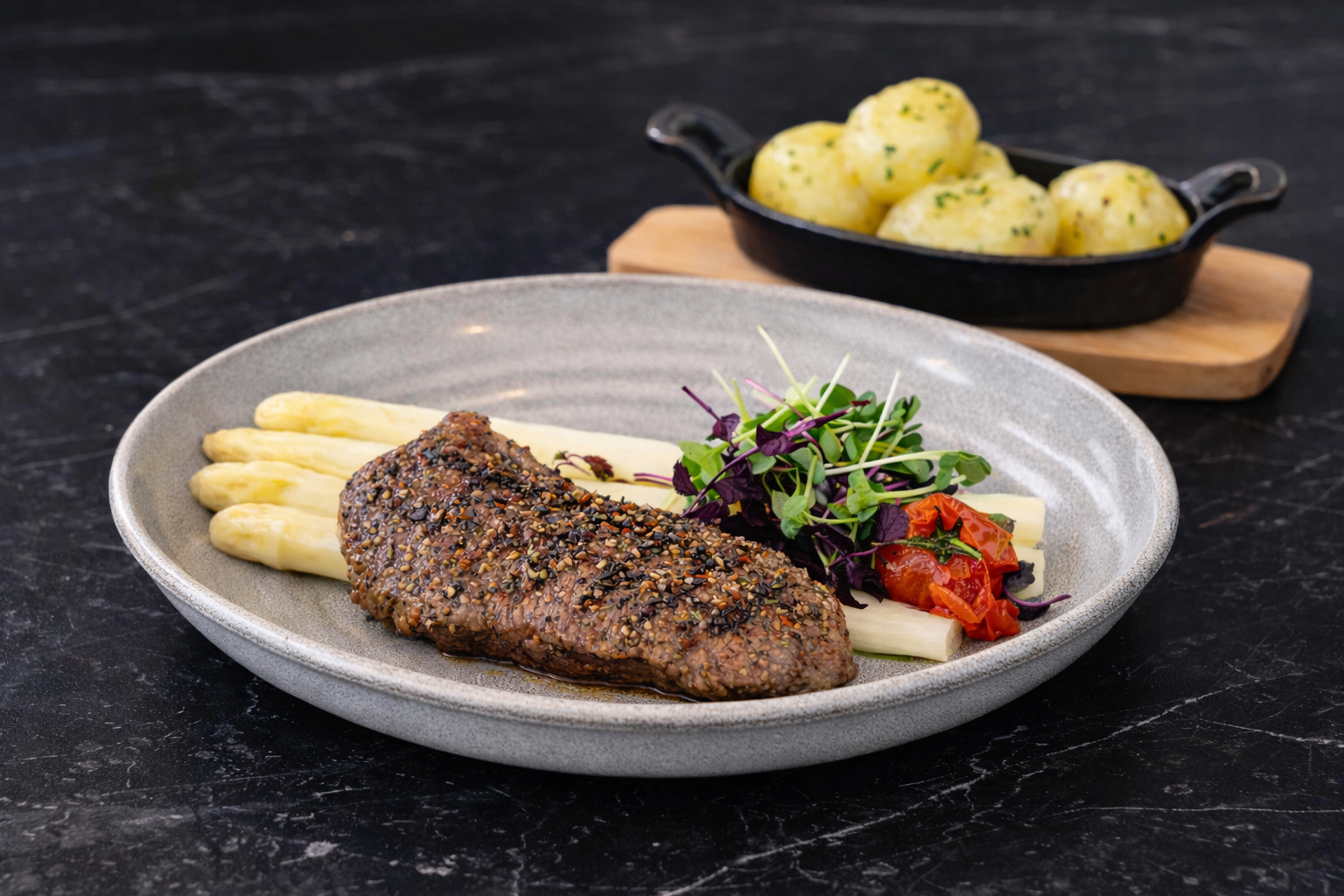 Succulent beef fillet with white asparagus, roasted tomatoes, fresh micro herbs and herb butter baby potatoes.