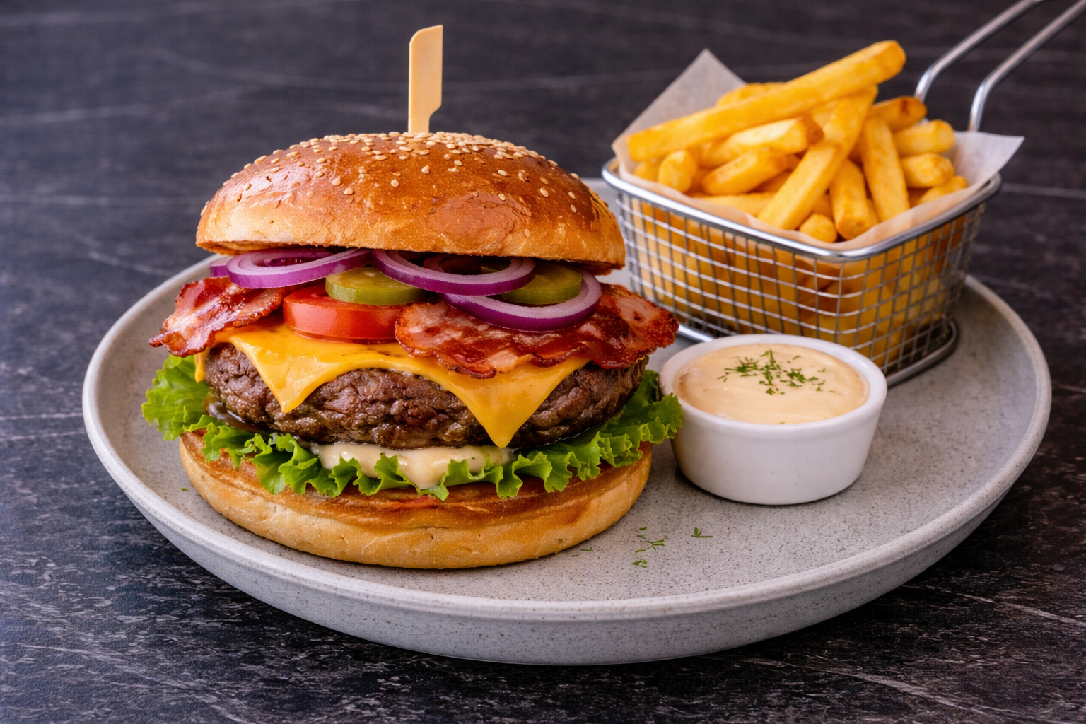 Grilled beef patty topped with melted cheese, fresh lettuce, tomato and house sauce in a toasted brioche bun.